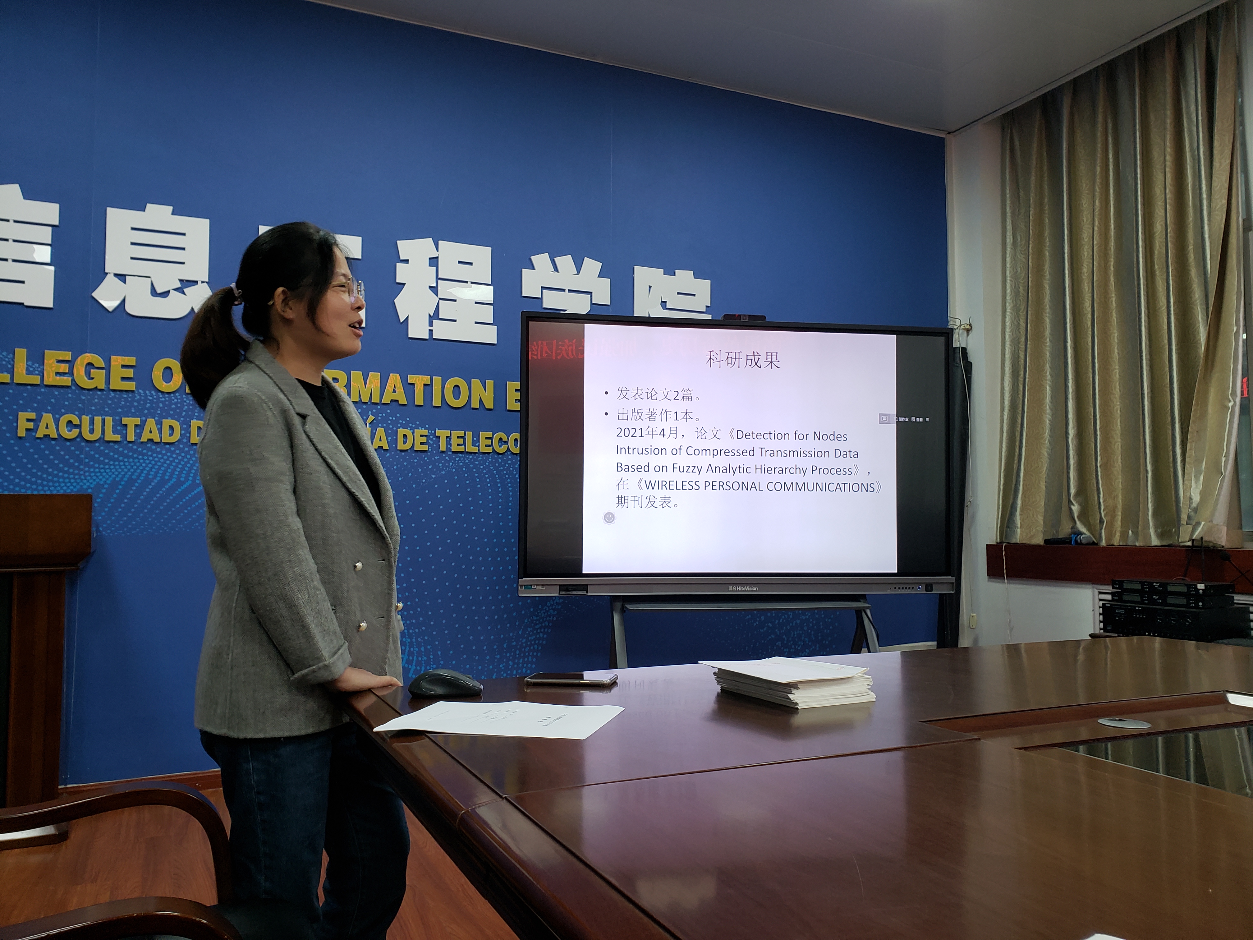 王亚飞老师以“基于模糊层次分析法的压缩传输数据节点入侵检测”为主题,汇报了在武汉大学一年来的见闻、学习及科研情况。通过一年的访学提升了业务素质,提高了师德师风,发表论文3篇,出版著作1本,参与校级科研项目一项。学术委员会老师们一致认为王亚飞老师圆满完成了访学任务,考核合格。