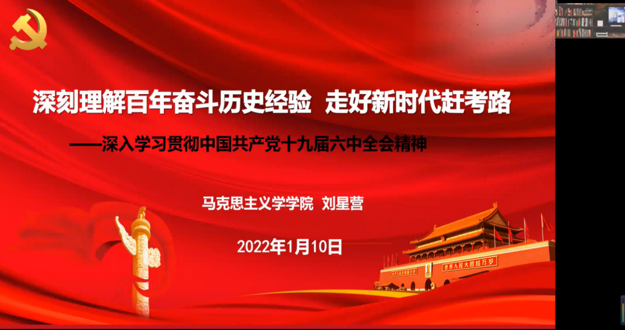 为增强学习宣传贯彻党的十九届六中全会精神的政治自觉、思想自觉、行动自觉,1月10日上午,best365足球官网教工党支部通过线上腾讯会议平台开展了“学习宣传贯彻党的十九届六中全会精神”主题党日活动。活动邀请了马克思主义公司思想政治教育教研室刘星营老师为大家作了题为“深刻理解百年奋斗历史经验 走好新时代赶考路”的报告,best365足球官网教工党支部书记孙泽军同志主持活动。