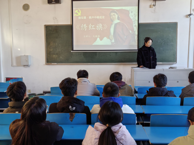 辅导员毛淑湘以“歌声中的党史——《绣红旗》”为题,深情讲述了革命先烈江姐为新中国诞生英勇牺牲的壮丽篇章,生动诠释了党的初心与使命。