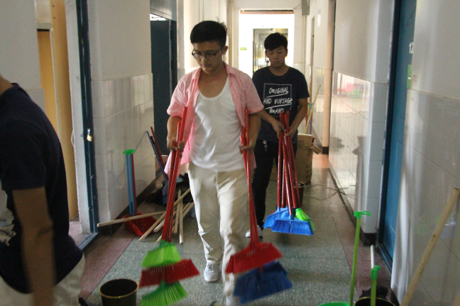 有的同学清扫地面,有的同学擦洗桌椅和床铺,有的同学擦玻璃,有的同学清理垃圾……经过近两个小时的劳动,45间宿舍在志愿者们的辛苦“奋战”下焕然一新。