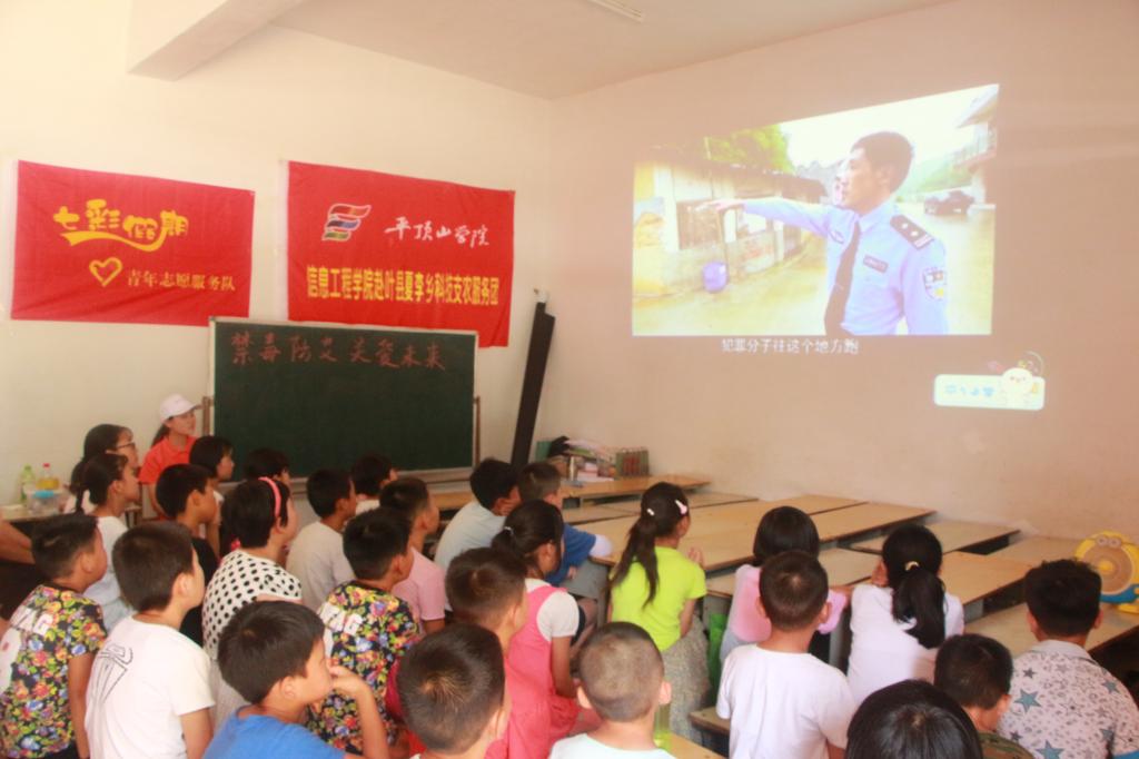 为了向小朋友们更好的科普禁毒防艾的相关知识,支教组的志愿者组织小朋友们观看了《国家禁毒宣传片》和《生命的断层 青少年防艾宣传》,引导小朋友们从感性的角度用理性的思维了解毒品和艾滋病对人们危害,帮助小朋友们树立正确的人生观,价值观。“艾”与被爱,连着红丝带,为了更好的引导小朋友们关爱艾滋病患者,去掉“有色眼镜”,在观影结束后,小朋友们与扮演艾滋患者的进行“爱的抱抱”,共同提升对艾滋病患者的关爱意识。