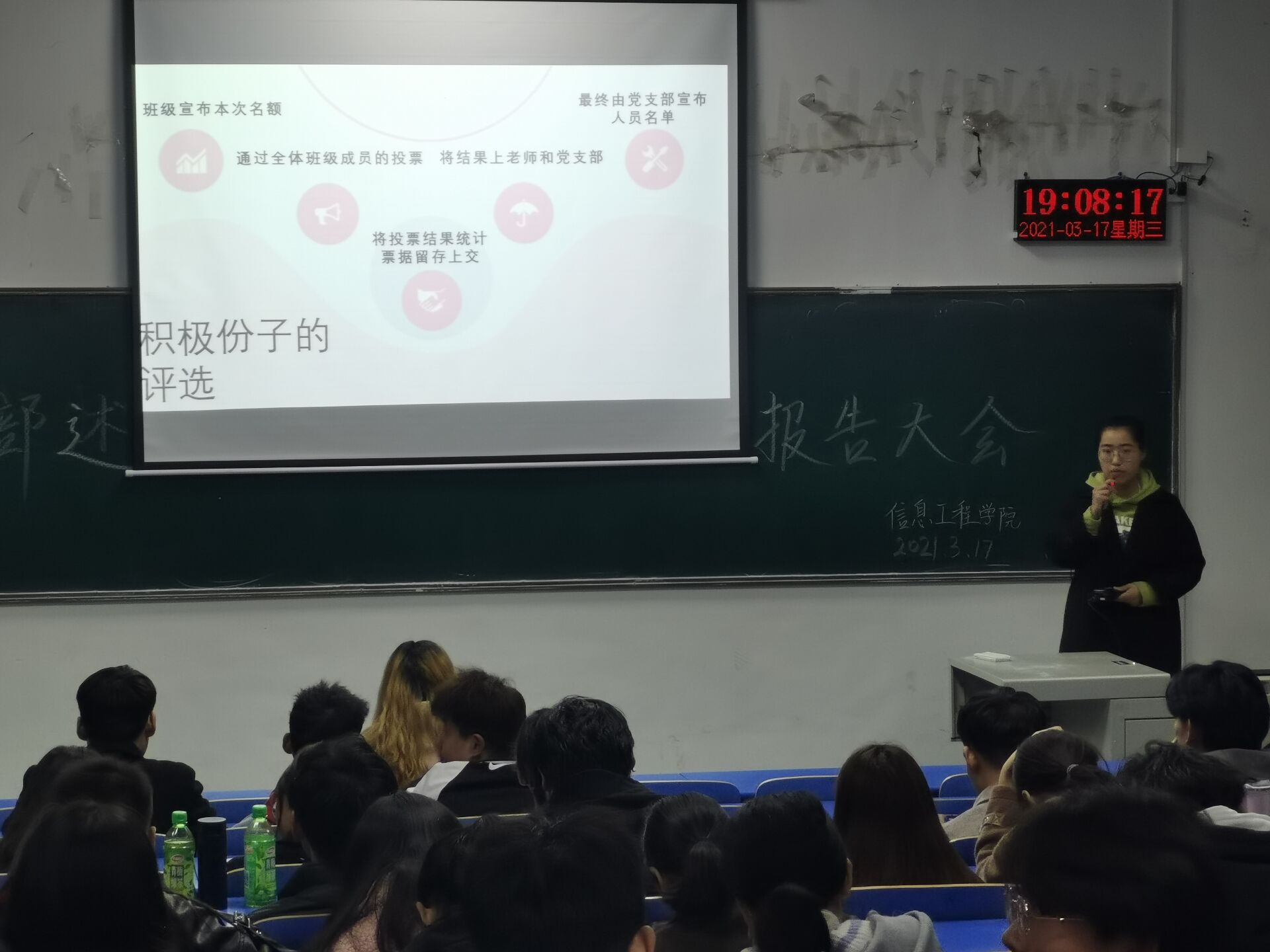述职会上,各团支部书记以PPT的形式围绕落实本支部年度共青团工作重点任务,特别是加强团员思想引领,团支部建设、班级活动开展情况、特色和重点工作、存在的问题、不足及下一步努力的方向进行认真述职,客观总结成绩、查找存在问题、提出改进措施。同时也对未来的工作做出了规划和展望。