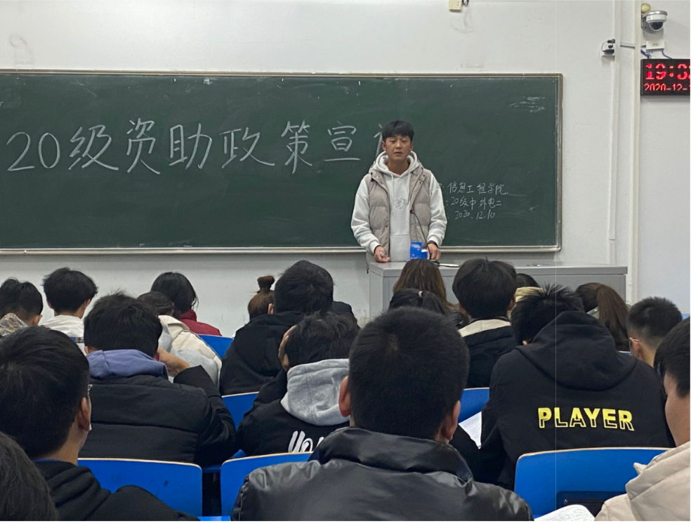 宣讲围绕助学金、奖学金、国家贷款展开。内容主要为家庭经济困难员工认定标准、助学金的资助标准、奖学金的分类与评选条件、国家助学贷款的条件、贷款额度与贷款期限等。
