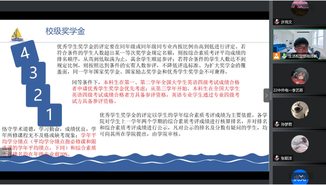 为贯彻落实高校资助政策,加强员工对资助政策的认识,做到精准资助。best365足球官网于2022年11月15日晚举行线上资助宣讲活动,best365足球官网生活权益部高扬帆担任主持,22级全体同学参加本次活动。