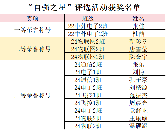 经过多位裁判老师公平而细致的评选,共有14名同学在“自强之星”评选活动中获得荣誉称号,其中获一等荣誉称号同学两名、二等荣誉称号同学三名,三等荣誉称号同学九名。