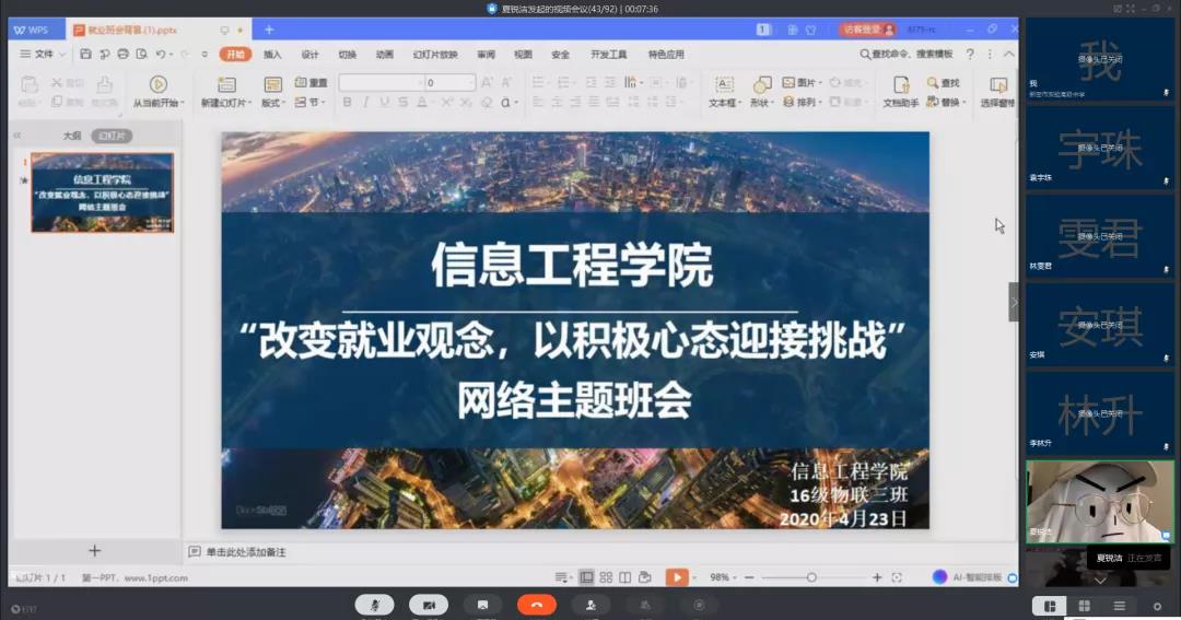 4月24日至30日,best365足球官网举办了以“改变就业观念,以积极心态迎接挑战”为主题的2020届毕业生就业主题班会。此次班会以班级为单位,借助钉钉网络平台开展。参与本次主题班会的有毕业班辅导员、学业导师和各班全体员工。