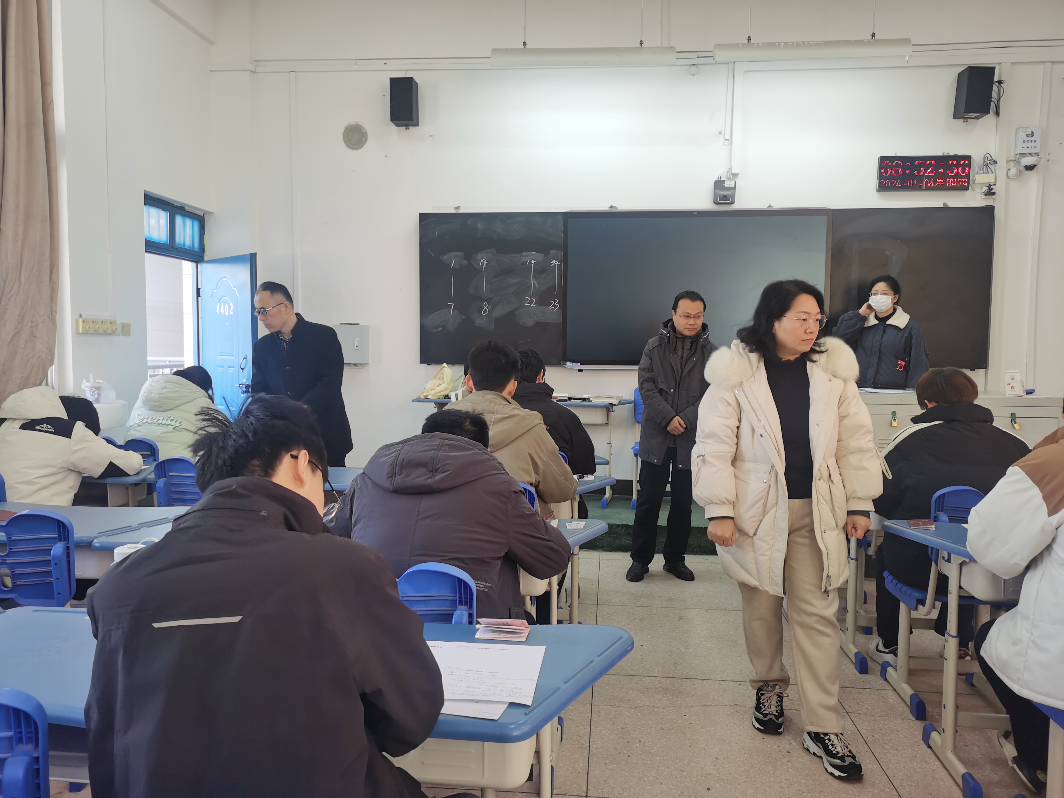 1月2日上午,公司本学期期末考试在严肃、紧张、有序的气氛中正式开始。领导班子王向前、樊爱宛、时合生、胡海峰到公司各考点巡视了考场环境、考生答题、教师监考等情况。从检查情况看,公司监考教师认真履责,同学们考试态度端正,精神饱满,自觉遵守考试纪律,考场秩序井然有序。