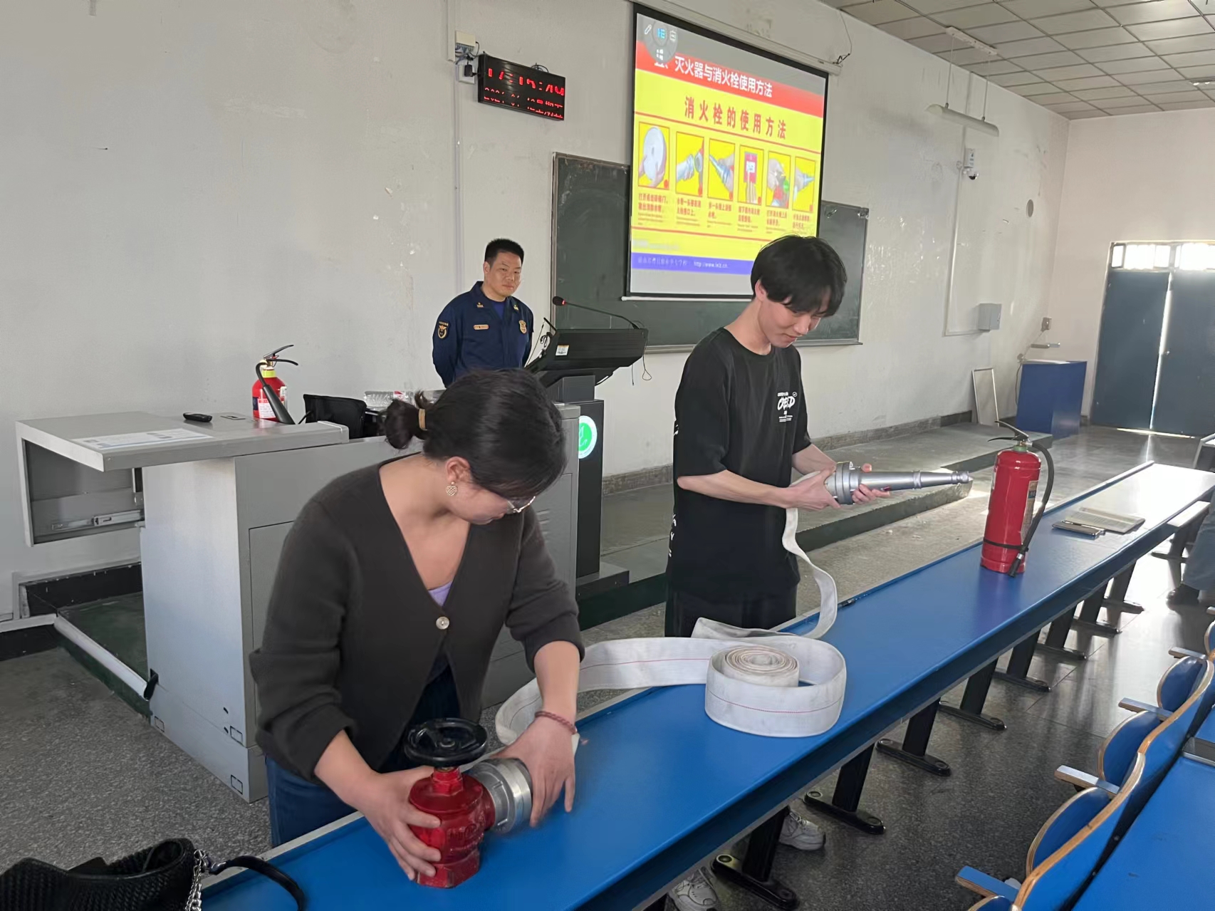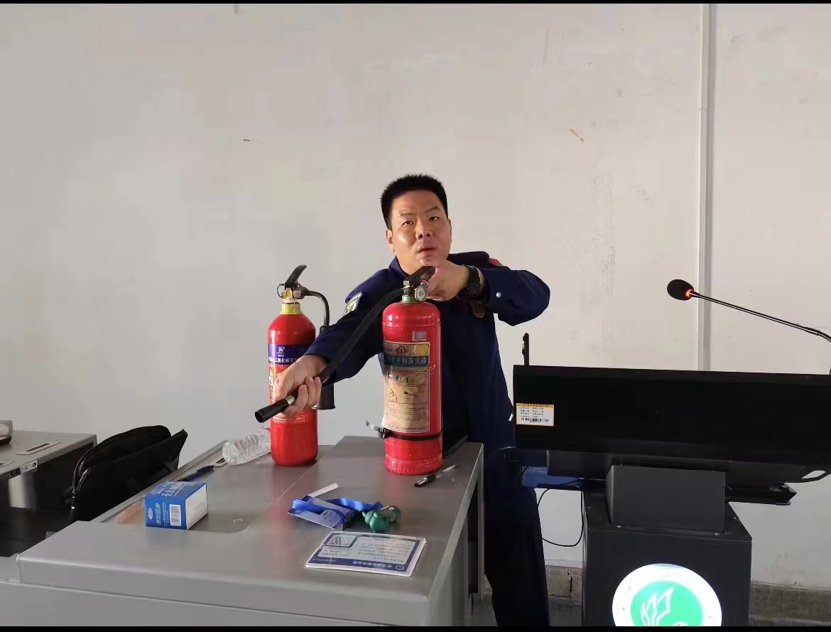 活动第三项,保卫处消防科陈红兵为大家详细介绍不同种灭火器的使用方法,并指导现场师生进行灭火操练。