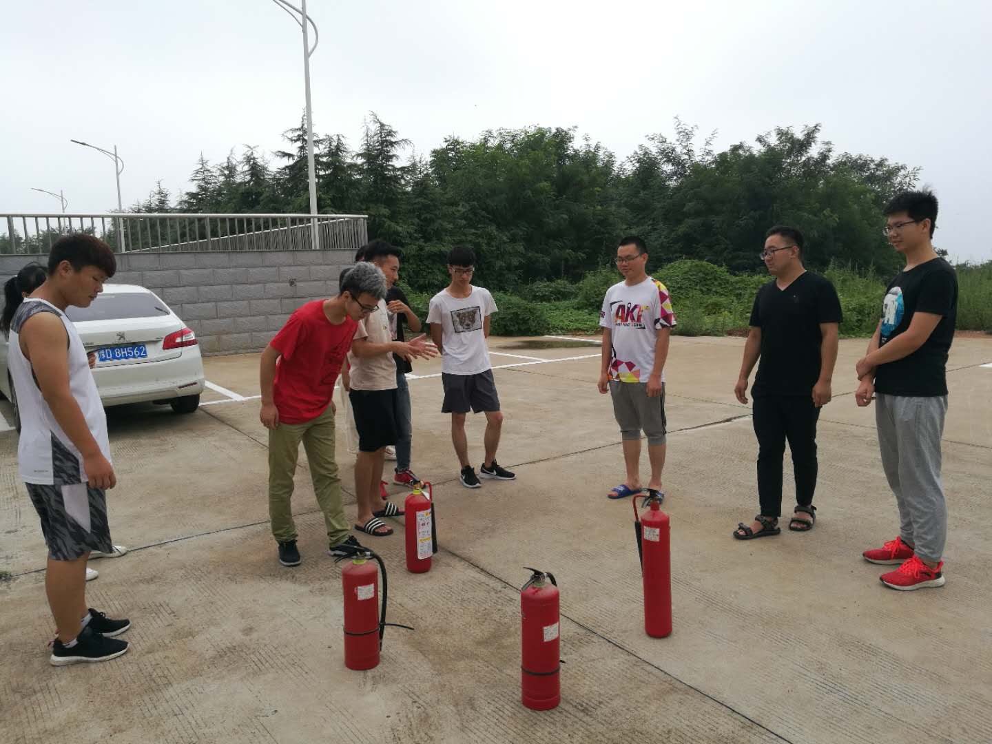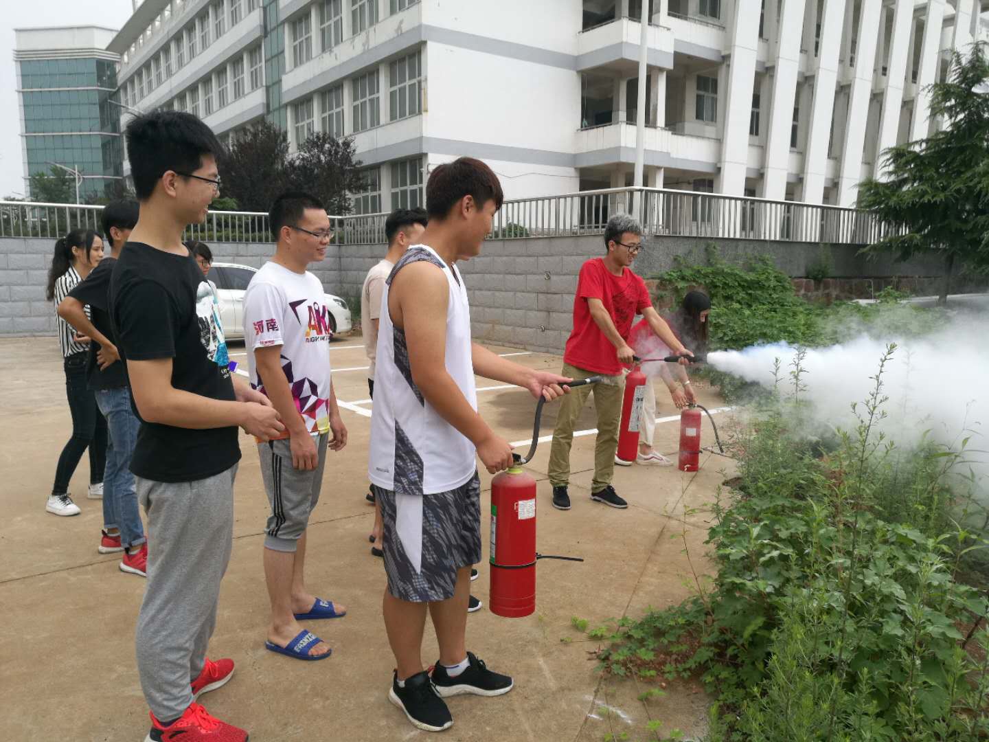 胡海峰老师给大家讲解了灭火器的使用方法:用力拉出安全插条,一手握住灭火器把手,一手握紧喷管,喷管对准火源基部,挤压把手,喷出白粉扑灭火源。随后,以小组为单位分组进行了灭火器的实战演练。